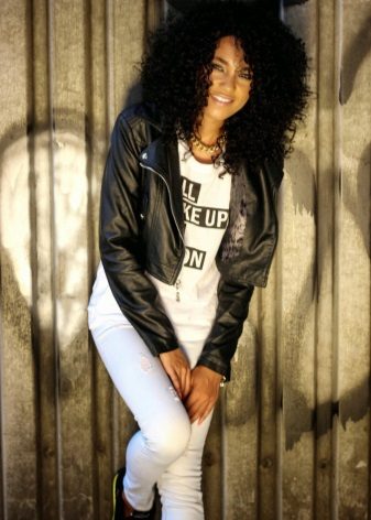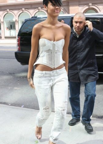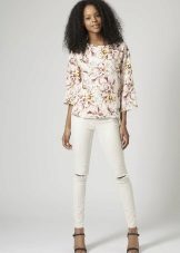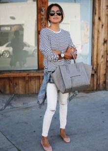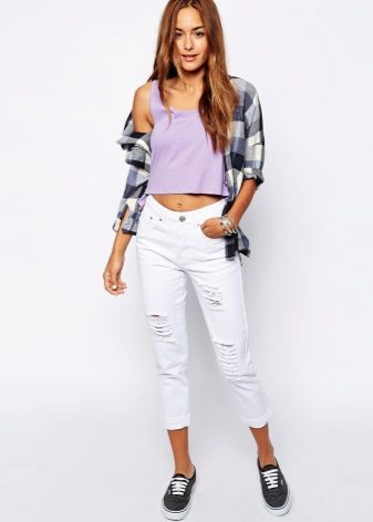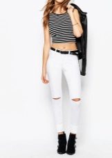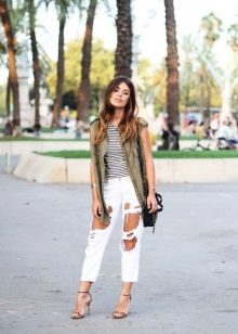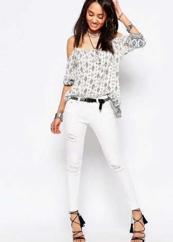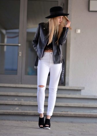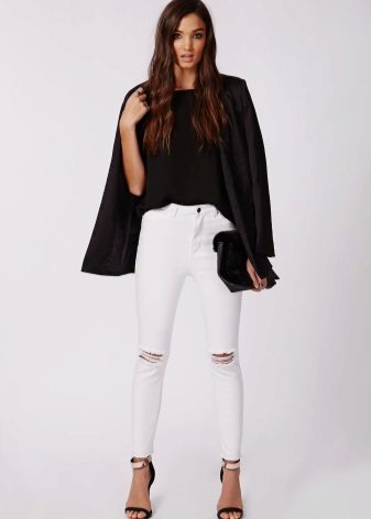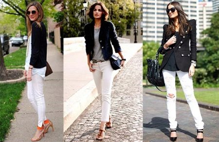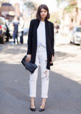 White jeans look good in tandem with a black loose-cut jacket and wide shoulders. When choosing tops and T-shirts, it is worth giving preference to models decorated with symmetrical patterns in bright color options. Torn white models can be combined with jackets or military-style tops.