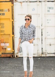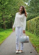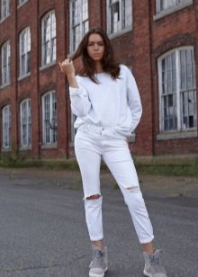 Today, every fashionista has stylish jeans in her wardrobe, and more than one pair in different colors. White jeans look elegant and beautiful, and holes give them style. They fit perfectly into the street style.