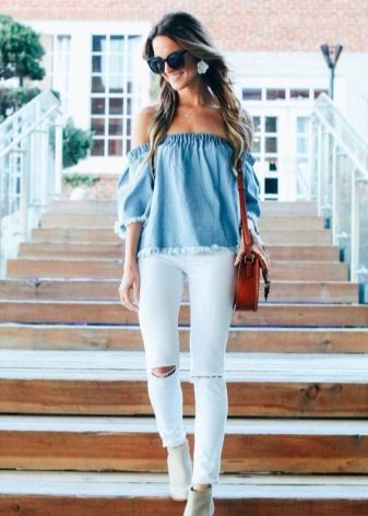 Ripped jeans should be worn with denim shirts of a simple cut, since this season they are in trend. Looks nice selection of top and bottom in contrast. Such an outfit can even be worn for work, provided that there is no strict dress code. A shirt should be preferred in the spring season.The blue top, which is associated with the blue sky, looks stylish.