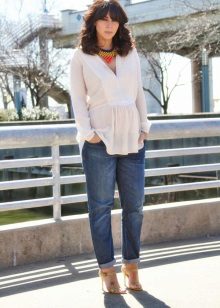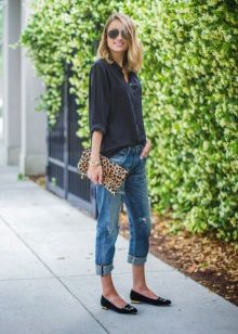 If you go on a date, boyfriend jeans will become the basis of a feminine look. They are perfectly complemented by a light blouse, high-heeled sandals and a small clutch.