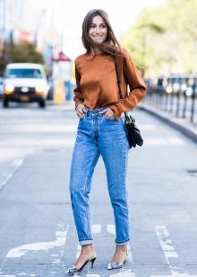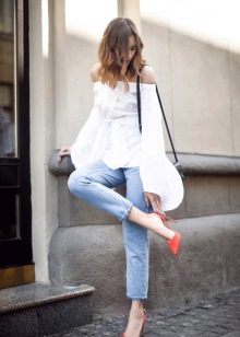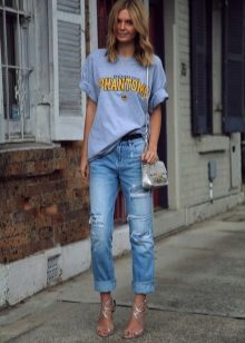 Going to a party, wear boyfriends with a bustier top or blouse embroidered with sequins. Mandatory high-heeled shoes - stylish sandals or pumps. A small handbag and laconic accessories complete the look.