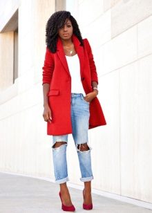 See for yourself how well boyfriends sit on girls with uniforms. Correct proportions are observed in the image, so the figures look slimmer. The basis of the image is jeans with scuffs and a dark gray t-shirt.Complementing it with a lingonberry suede leather jacket and a red clutch. Nude boats visually lengthen the leg, further stretching the silhouette. It looks perfect!