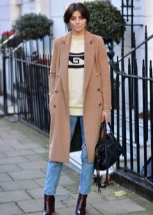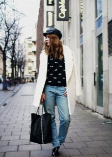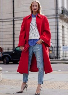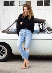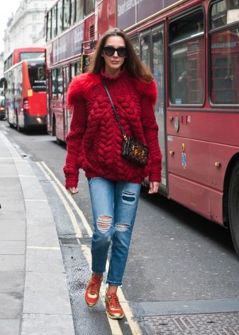 Boyfriends go well with a thick sweater made of thick yarn, which can replace outerwear. To balance the silhouette, add high-heeled shoes. Sneakers are permissible only if you are confident in the impeccability of your slim figure.
