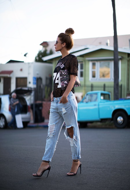 Stylish summer look, suitable for a fashion party. Light-colored boyfriends with holes are complemented by a guipure t-shirt with a print borrowed from a sports uniform. Such a kit looks quite interesting, and in combination with laconic stiletto sandals and a small clutch, it will not leave you any chance at all to go unnoticed. Please note that replacing sandals with flat shoes, and wearing a less active T-shirt, you will get a great look for every day.