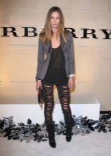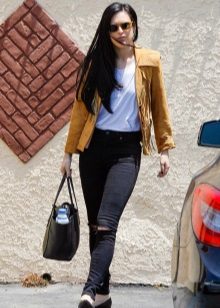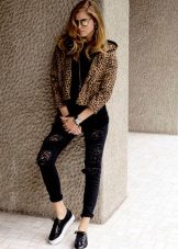 Fergie was seen in black ripped jeans in combination with a black top and high-heeled shoes decorated with a leopard print. Gwyneth Paltrow wears torn models with a classic black jacket, but a blue scarf acts as a bright accent.