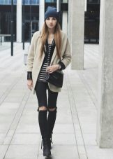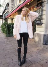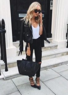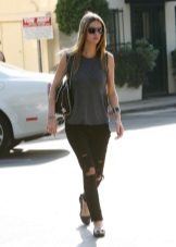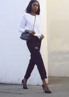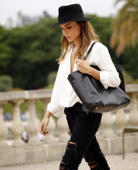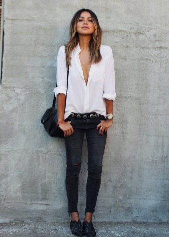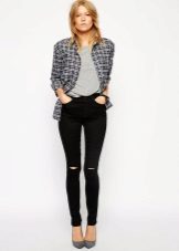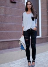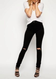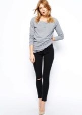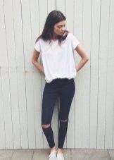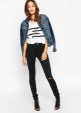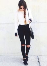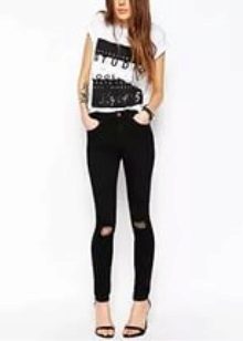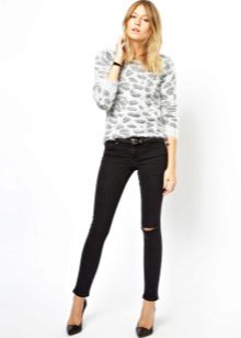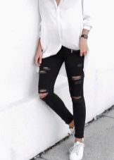 Many women prefer skinny jeans that can be worn to embody the look in a sporty or casual style. If you are interested in a business look, then you should wear a white blouse with a classic cut and stilettos. Be sure that the holes in the jeans will not interfere with your image of an elegant business woman.