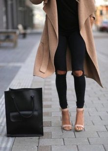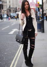Often, business women who must dress in accordance with the dress code every day want to radically change their clothing style on weekends. Then jeans with torn knees are a great solution.
