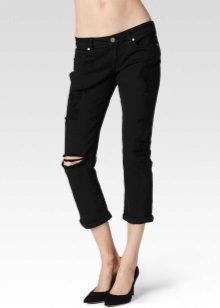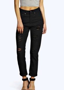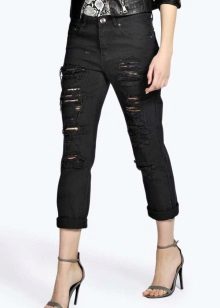 Designers often offer jeans models of different styles, decorated with holes. Ripped boyfriend jeans, which in many ways resemble male models, are very popular. Torn elements give this style of sophistication and originality. It is the holes that add negligence to them. The combination of black ripped black boyfriend jeans and high heeled shoes is great.