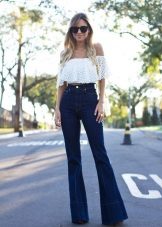 White jeans of a different cut look beautiful with black jeans. You can prefer loose fit, which will hide a small stomach or lush hips.