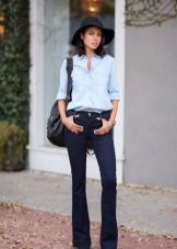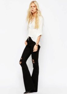 Today, flared jeans are trendy, which are suitable for creating a stylish look in different styles. Flared black jeans should be worn with a blouse decorated with a floral print or ethnic ornament.