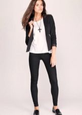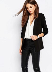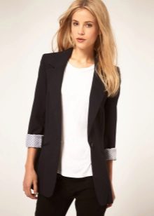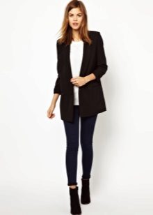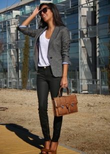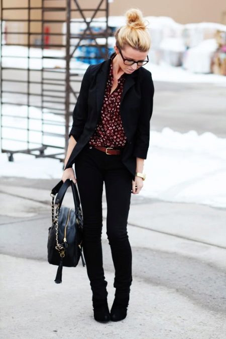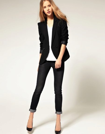 Black jeans look great in tandem with jackets both elongated and shortened. The first style will hide the flaws of the figure, and the second will add elegance to the office bow.