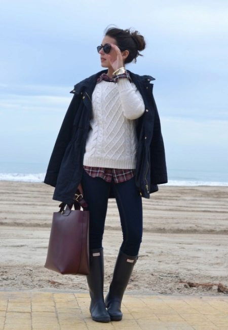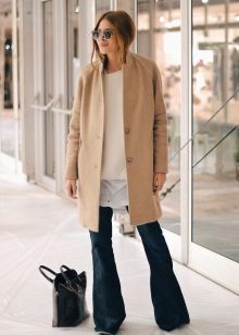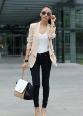 The combination of black jeans with a white fitted blouse and a shortened black jacket looks very fashionable. When choosing a top, many fashionistas prefer a white T-shirt, on top of which you can wear a warm cardigan in a sand, coffee or beige shade.