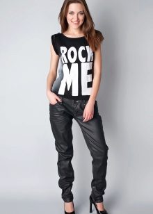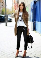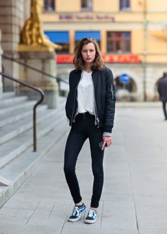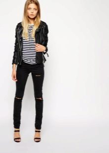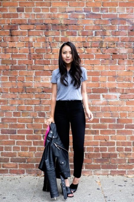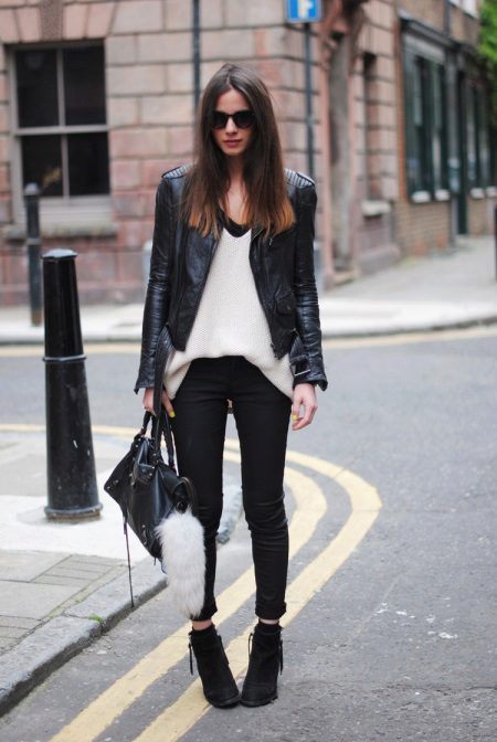 If you want to look fashionable and refresh your look, then you should use everyone’s favorite combination of white and black. Black jeans look great in combination with a snow-white T-shirt, with which you should wear a jacket-leather jacket. The choice of shoes depends, of course, on the season, but high-heeled models are welcome.
