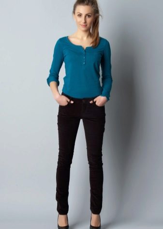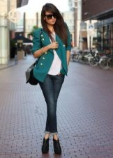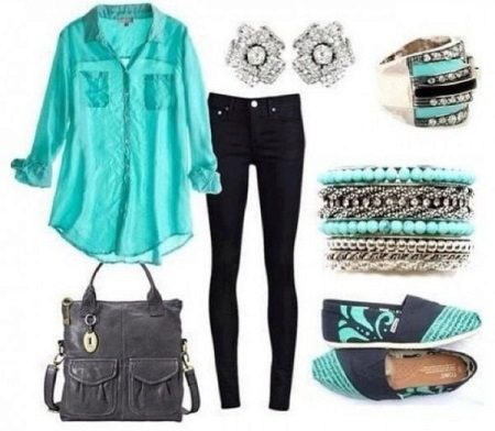 To create a glamorous, vibrant look, consider pairing black jeans with a turquoise blouse. The perfect complement will be jewelry on the marine theme, as well as a spacious bag in tone with jeans. But the shoes can be both black and turquoise.