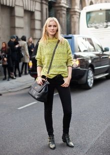 Black jeans with a turtleneck, cardigan or pullover are a beautiful tandem. Shoes on the platform, as well as exquisite accessories, will help to complement the unique image.