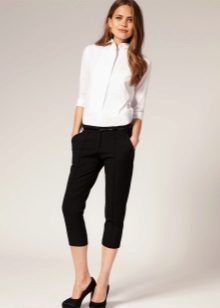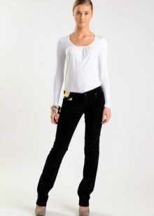 Black jeans are universal clothing, because they can be combined with almost all elements of the wardrobe. The black bottom with a white top looks very stylish, the contrast is the highlight of the image. With jeans, you can wear a snow-white shirt of a classic cut. On a cool day, you can complement a stylish bow with a white jacket. A beautiful brooch with a large stone will become a beautiful decoration of the silhouette.