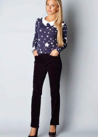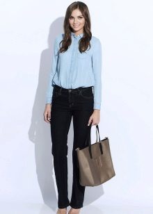 The combination of jeans with a blouse decorated with a unique print and a black jacket is a stylish tandem. But lovers of bright colors will be able to create a romantic look thanks to the combination of black jeans with a blue shirt, over which you can wear a white jumper.