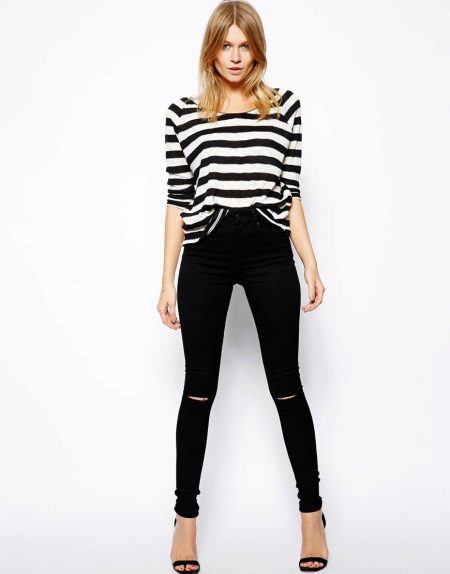 Many girls prefer ripped jeans models that look fashionable and bright. A black and white striped vest and stiletto sandals will complement the unique bow.