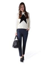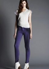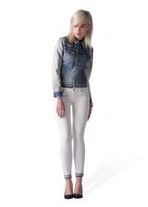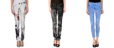Light, almost white jeans look very impressive with dark blue blots randomly scattered on them.