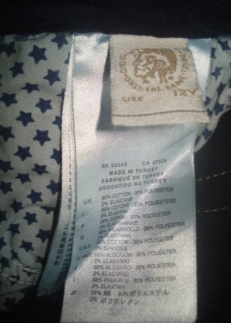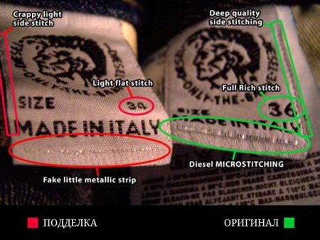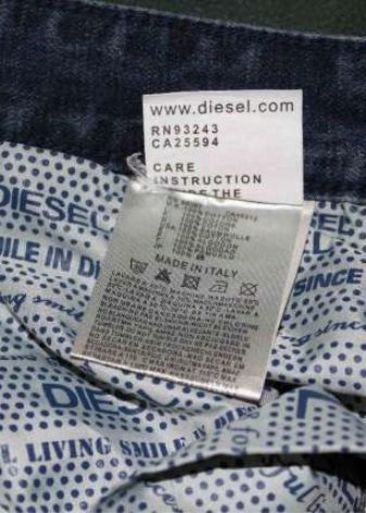 Real Diesel jeans can have three labels placed together. The first shows the size, company logo and the inscription: made in Italy.