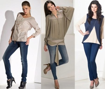 Although outwardly jeggings are very similar to jeans, they should be considered as leggings when choosing wardrobe items. They create a magnificent ensemble with tunics or dresses, sweaters or cardigans. It’s better to hide the belt under clothes. The ideal length of the top covers 2/3 of the buttocks.