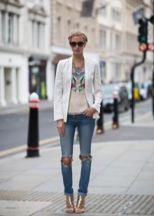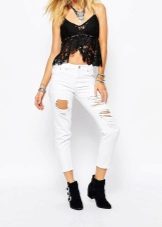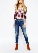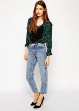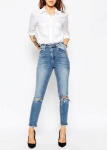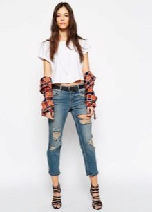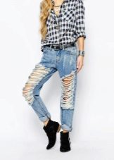 Models with holes can be safely combined with a monophonic elongated coat or jackets made of genuine leather. For warm days, a T-shirt and a checkered shirt over are ideal.