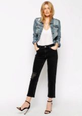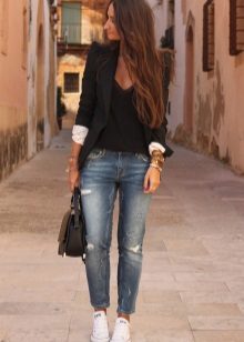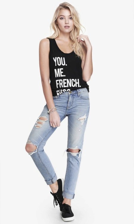 The simplest but most stylish combination is a girlfriend jeans ensemble with a black tank top decorated with a fashionable print or lettering and black comfortable sneakers. Abrasions and holes on jeans give audacity and rebellion a unique look for every day.