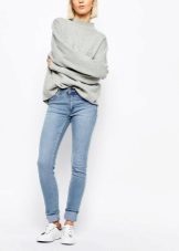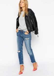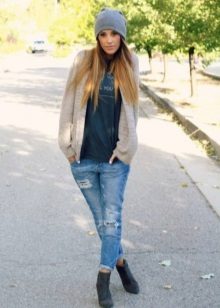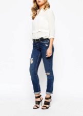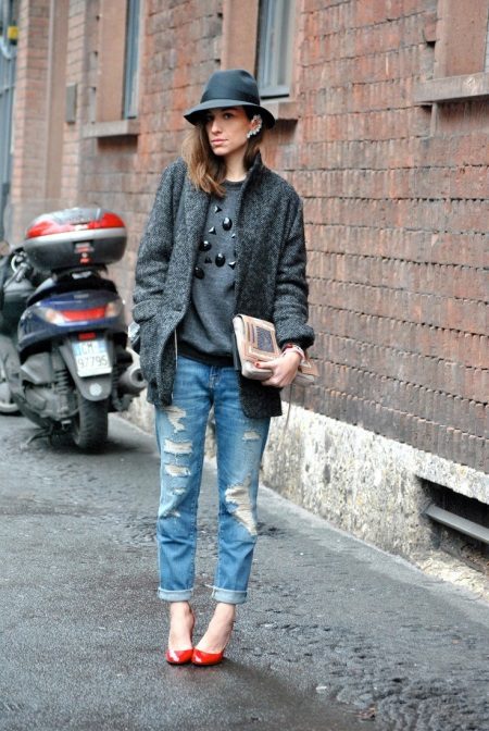 Ripped jeans are a great match for an on-street look. They can be worn with warm sweaters with a variety of decor. A warm jacket and a stylish hat will add charm and charm, and red high-heeled shoes will become a fashionable accent.