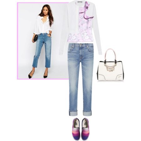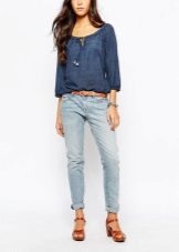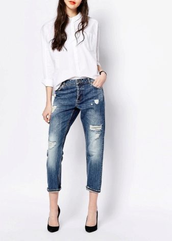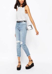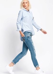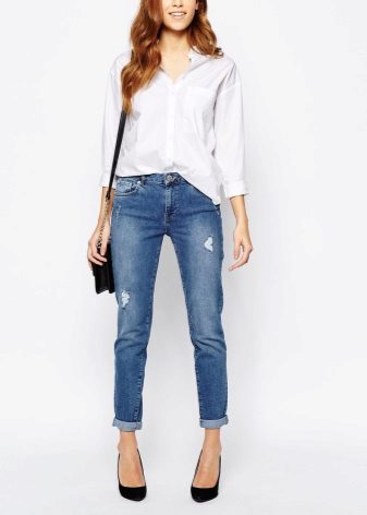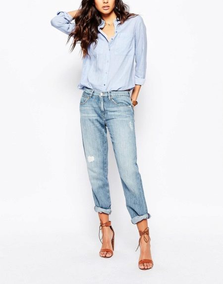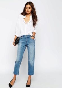 For hot summers, light blue gerfrends are ideal in combination with a snow-white blouse or a delicate top decorated with a print in soothing colors, in tandem with a white jacket. For a business meeting, it is better to wear black stilettos and a small clutch bag to match the shoes, and for a walk with friends - bright moccasins and a capacious bag that matches the top.