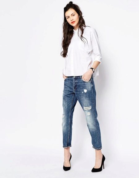 Despite the fact that girlfriend jeans are presented in a street style, they can become a bright accent in creating a fashionable look for a modern business lady. They should be combined with a classic white blouse and a free cut. A tucked-in jeans top accentuates the style of the Girlfriends, and stiletto sandals add elegance and grace.
