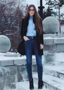 - High waist. Another name for these models is mom-jeans.Such jeans are presented in classic colors: blue, black and blue. High waist jeans can also have prints. They can be narrowed to the bottom, with scuffs or tears. Such models are best worn with thin blouses or t-shirts tucked into jeans.