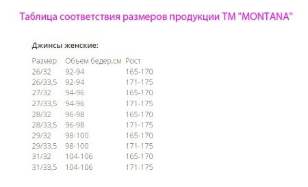 Montana jeans can be easily sized thanks to the mesh size. You need to know your height and waist circumference. On each model, two indicators indicate this - W (volume in the belt) and L (leg length along the inner seam).