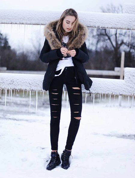 Winter long coat, ankle boots and jeans with holes in the lap can be worn in warm winter weather.