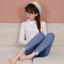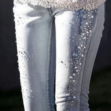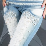 Pearl beads and rhinestones give even the most ordinary jeans of simple cut a sophisticated and expensive look. Jeans decorated in this way can easily become the basis for creating an image in a romantic, glamorous, classic style.