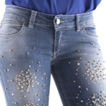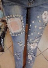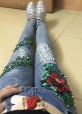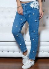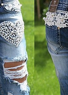 Rhinestones, pearls and beads used to create the decor make the most ordinary jeans an example of design art. Such decor is often used in addition with inserts made of materials contrasting in color and texture, for example, leather, lace, silk, etc.