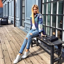 Variegated shirts, blouses and tops with a large geometric pattern, floral patterns, colorful lettering, etc. work well with such jeans.