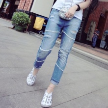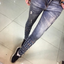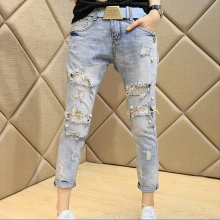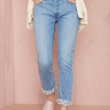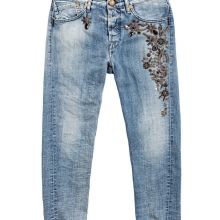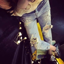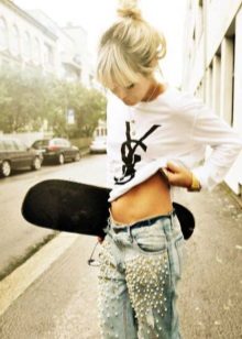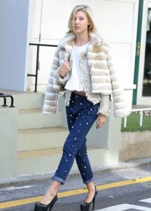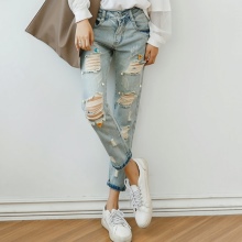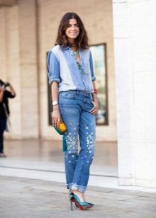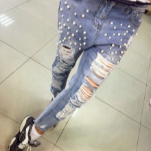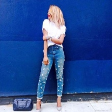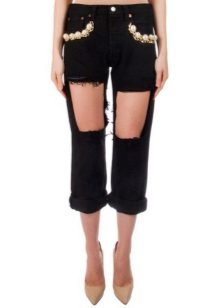 - BoyfriendsThe effect that such jeans decorated with beads will produce is based on a game of contrasts: straight, wide trousers, tucked down - more likely a man's style. Elegant decor in the form of rhinestones or pearl beads will soften the image, make it more feminine and sexy.