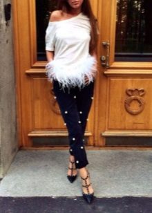 - Skinny models. One of the most feminine and beautiful options. Skinny jeans, beautifully fitting a thin waist and long legs, already in themselves look very stylish. Additional decoration in the form of beads of one or several colors will certainly attract attention to this outfit.