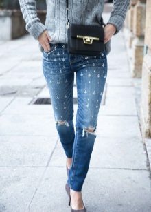Pearls and rhinestones are considered one of the most striking and beautiful jewelry for jeans. In such smart, sparkling or shiny jeans, you can safely go to a youth club, a party, a festive event, etc.