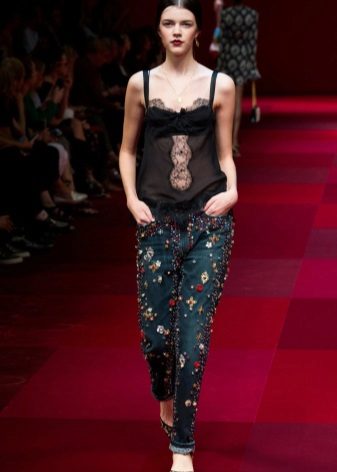 Modern designers offer a variety of jeans models, on which jewelry in the form of beads, pearls or rhinestones look the most stylish and spectacular.
