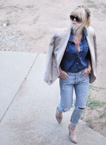 Beaded jeans, no doubt, become the main focus of any image. Therefore, it is customary to choose a more relaxed and strict top for such jeans, for example, a smooth plain top, a classic T-shirt, a strict blouse, etc.