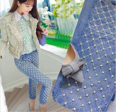 Jeans decorated with beads, rhinestones or pearls make it possible to quickly and easily transform even the most modest and strict outfit literally beyond recognition.