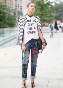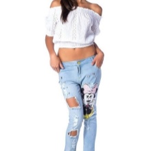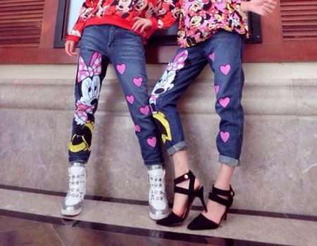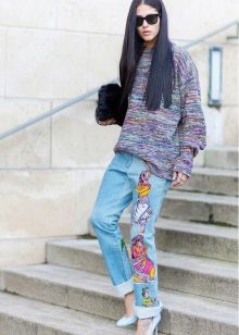 Teenagers are more interested in jeans models decorated with cartoon characters. The main characters of the Disney studio are especially popular. Bright and colorful Mickey Mouse will be a worthy decoration for any pair of jeans. With this model it is worth wearing a lace top or a loose cut pullover. When choosing shoes, you should give preference to convenience. So, with jeans that are decorated with funny characters, sneakers, sandals or sandals on a high wedge will look great.