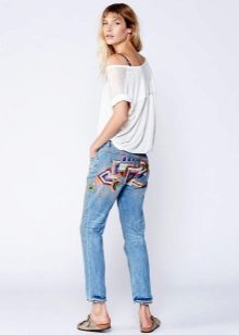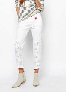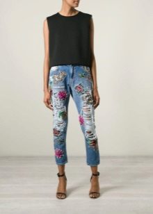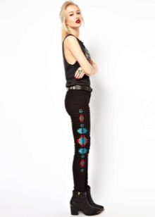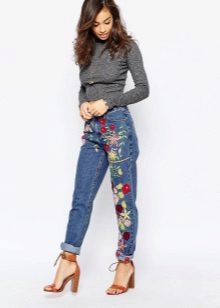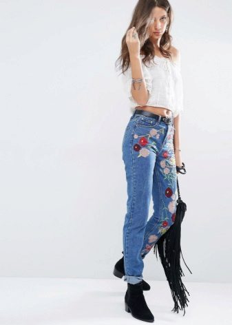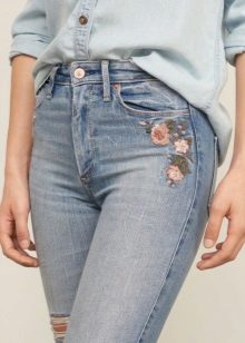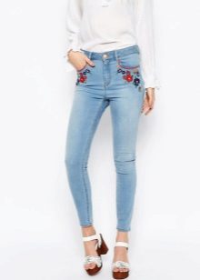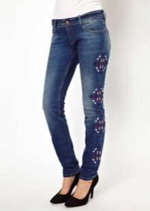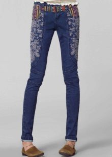Jeans of any style and color can succumb to any embroidery technique. For example, tight-fitting jeans decorated with rhinestones on the sides look elegant. They are perfect for meeting friends and for special occasions.