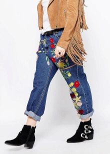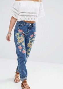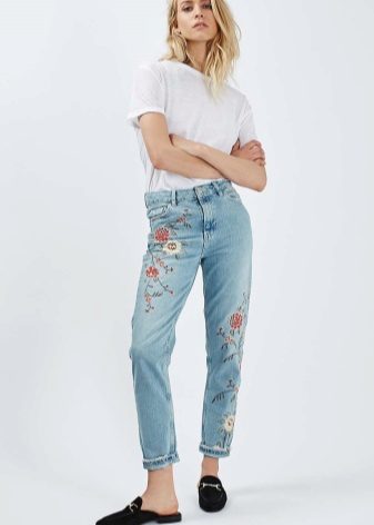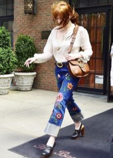 Embroidered jeans immediately stand out from the rest due to their unusualness and charm. To create a unique look with such jeans, it is worth choosing a plain top in calm, pastel shades and soft accessories.
