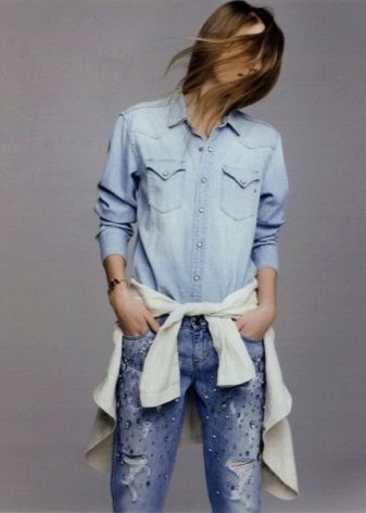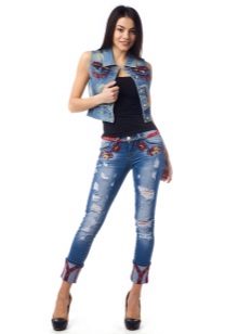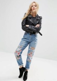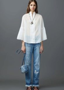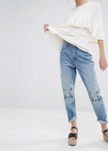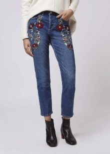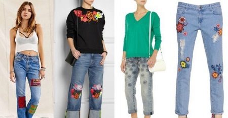 Such models look beautiful in tandem with loose cut blouses or crop tops. An excellent complement to the image with jeans decorated with embroidery will be a pastel-colored pullover and sandals on a high wedge. Jeans are already a striking decoration of a fashionable look, so you should abandon massive jewelry. In the cool season, a stylish bow can be complemented with a denim or leather jacket.