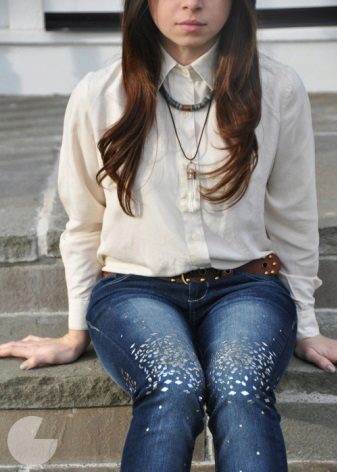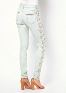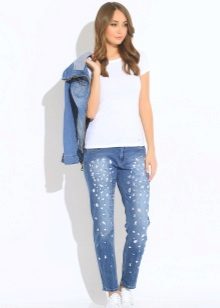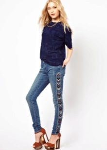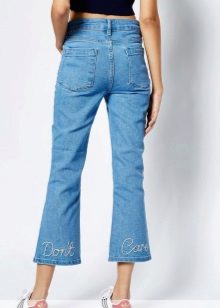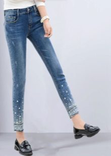 Jeans with rhinestones are in great demand among the fair sex. Some fashionistas decorate them with their favorite jeans on their own. It should be careful in the amount of decor. Less is better.