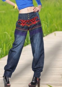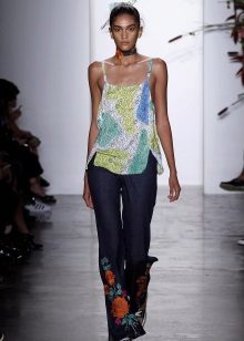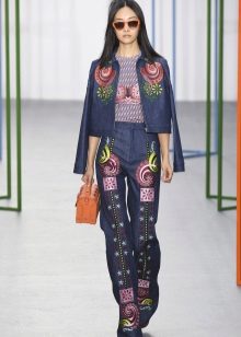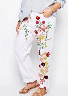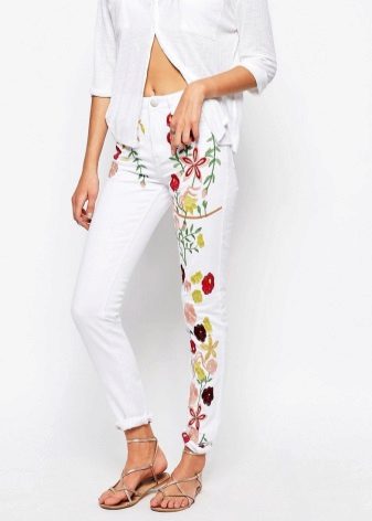 Models where embroidery is used at the waist and at the bottom of the legs look chic. This approach allows you to create harmony in the image. Flower motifs are very popular. If you choose the location of the picture, you can hide the flaws of the figure and emphasize its advantages.