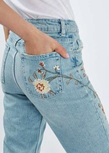 Embroidery can adorn any place in jeans, but you should avoid those areas that lend themselves to frequent deformation. For example, the pattern on the knee will lose its shape over time.