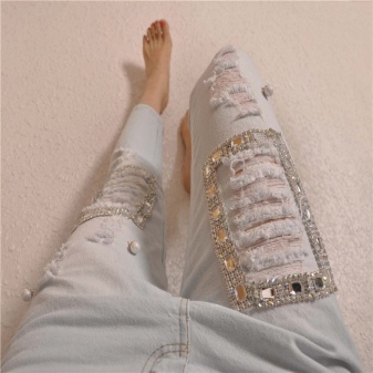 To create a shocking bow, you should take a closer look at jeans with beadwork. They look simply charming, but it is worth remembering the gentle care so that the beads do not lose their bright appearance.